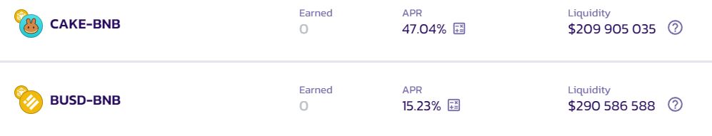 (Exempel på farming från PancakeSwap. Vid staking av CAKE/BNB LP-token gavs vid detta tillfälle ca 47 % i årlig procentuell avkastning.)