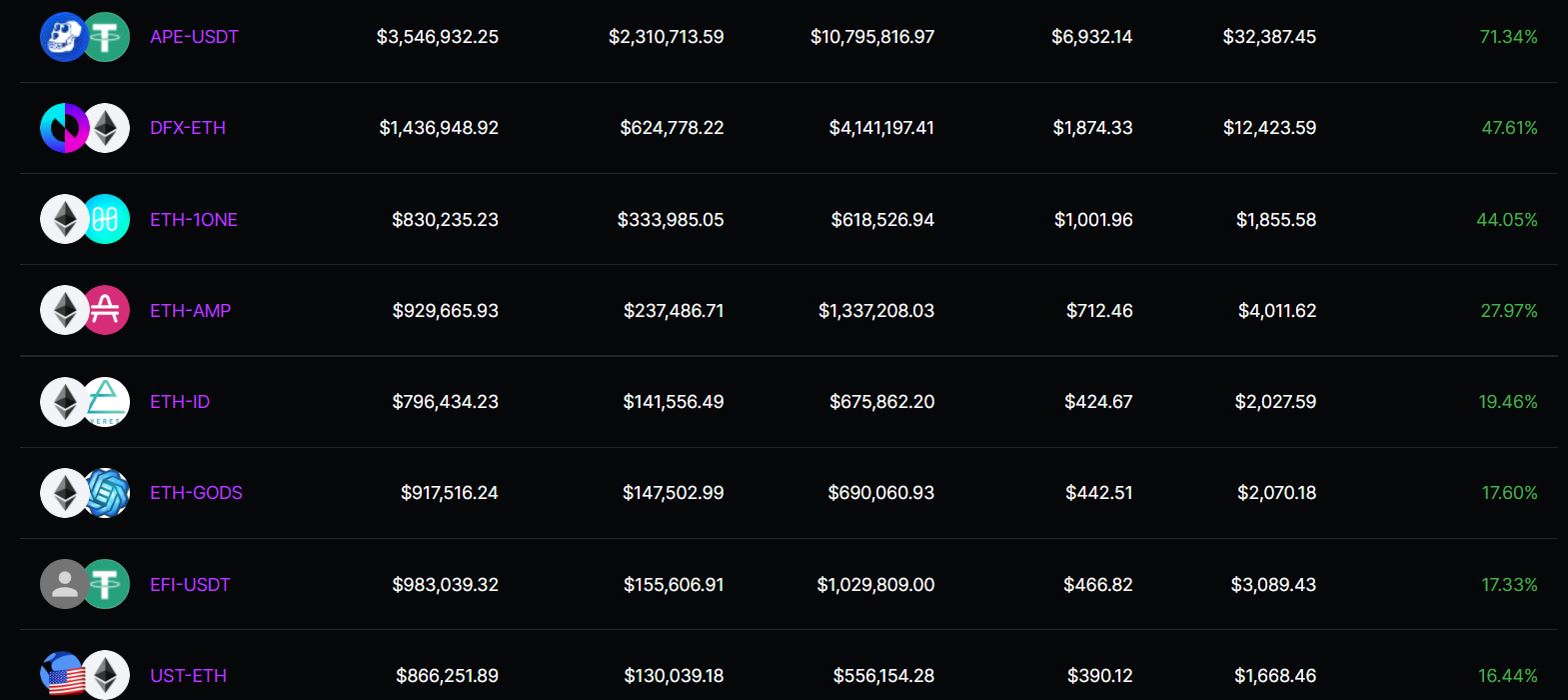 (Exempel från SushiSwap. Beräknad avkastning anges i grönt längst till höger och varierar dag från dag beroende på handelsvolym och tillfört kapital. Generellt ges högre avkastning vid pooler som består av mindre valutor)