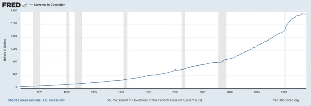 Antalet dollar i cirkulation har stigit kraftigt i samband med att man gick ifrån guldstandarden. I augusti 1971 fanns det cirka 58,90 miljarder dollar i omlopp. I början av 2024 fanns det istället 2 328,42 miljarder USD i cirkulation.