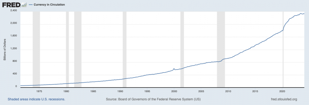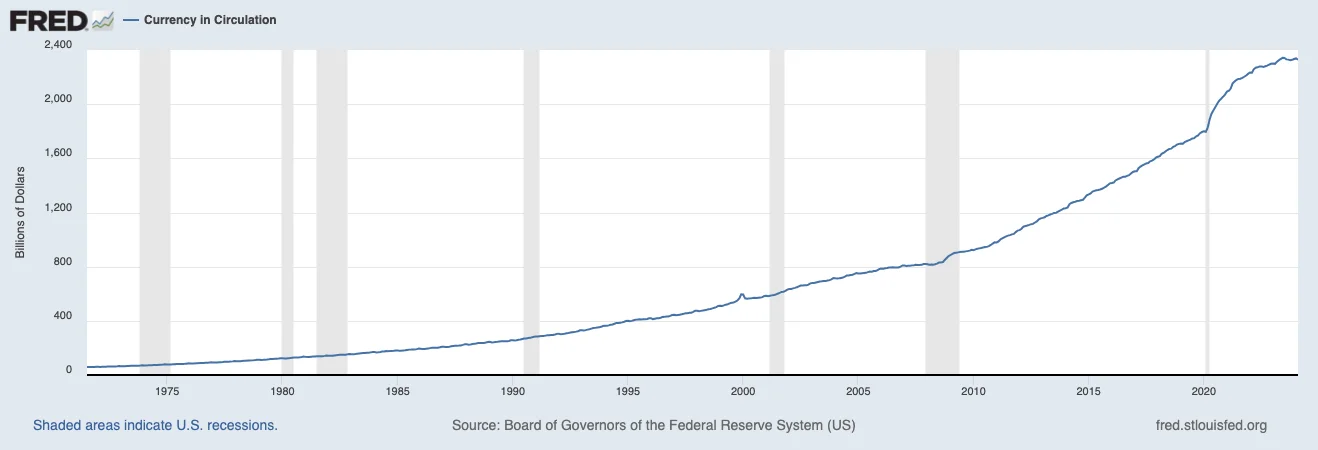 Grafen ovan visar antalet dollar i cirkulation mellan 1971 och 2024. I början av perioden fanns det cirka 58,90 miljarder dollar i omlopp. I början av 2024 fanns det istället 2 328,42 miljarder USD i cirkulation. Det ger en ackumulerad utspädningseffekt på ca 7.18 % per år. Det finns inget tak för hur många dollar som FED kan skapa, vilket gör det till en osäker värdebevarare över tid. Läs mer i kapitel 3.