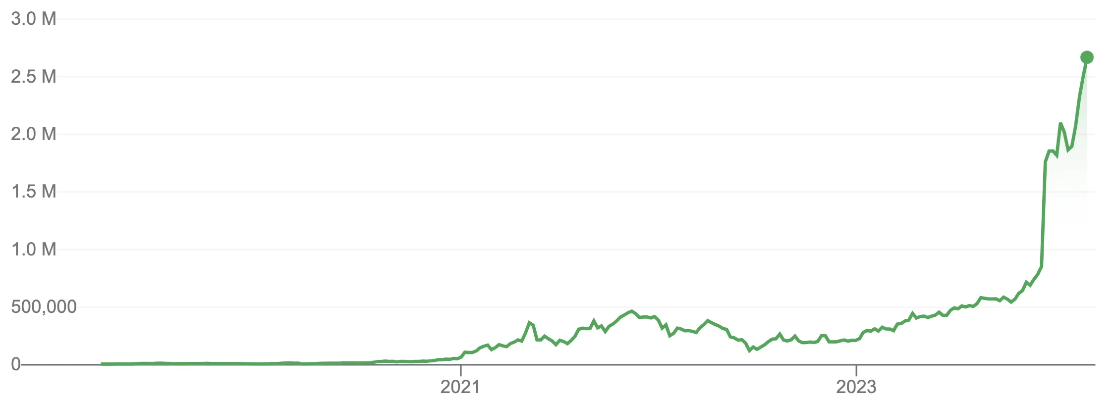 Det första exemplet nedan visar hur valutaparet ETH/ARS fluktuerat över tid. Förkortningen “ARS” står för argentinsk pesos. Nedan visas ethereums kursutveckling i ARS mellan 2019 och 2024.