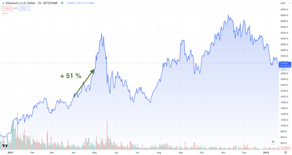Nyheten kunde ses som ett starkt stöd och ett bevis på ethereums växande acceptans i den traditionella finansiella sektorn. Nedan visas en graf över ethereumkursen år 2021.
