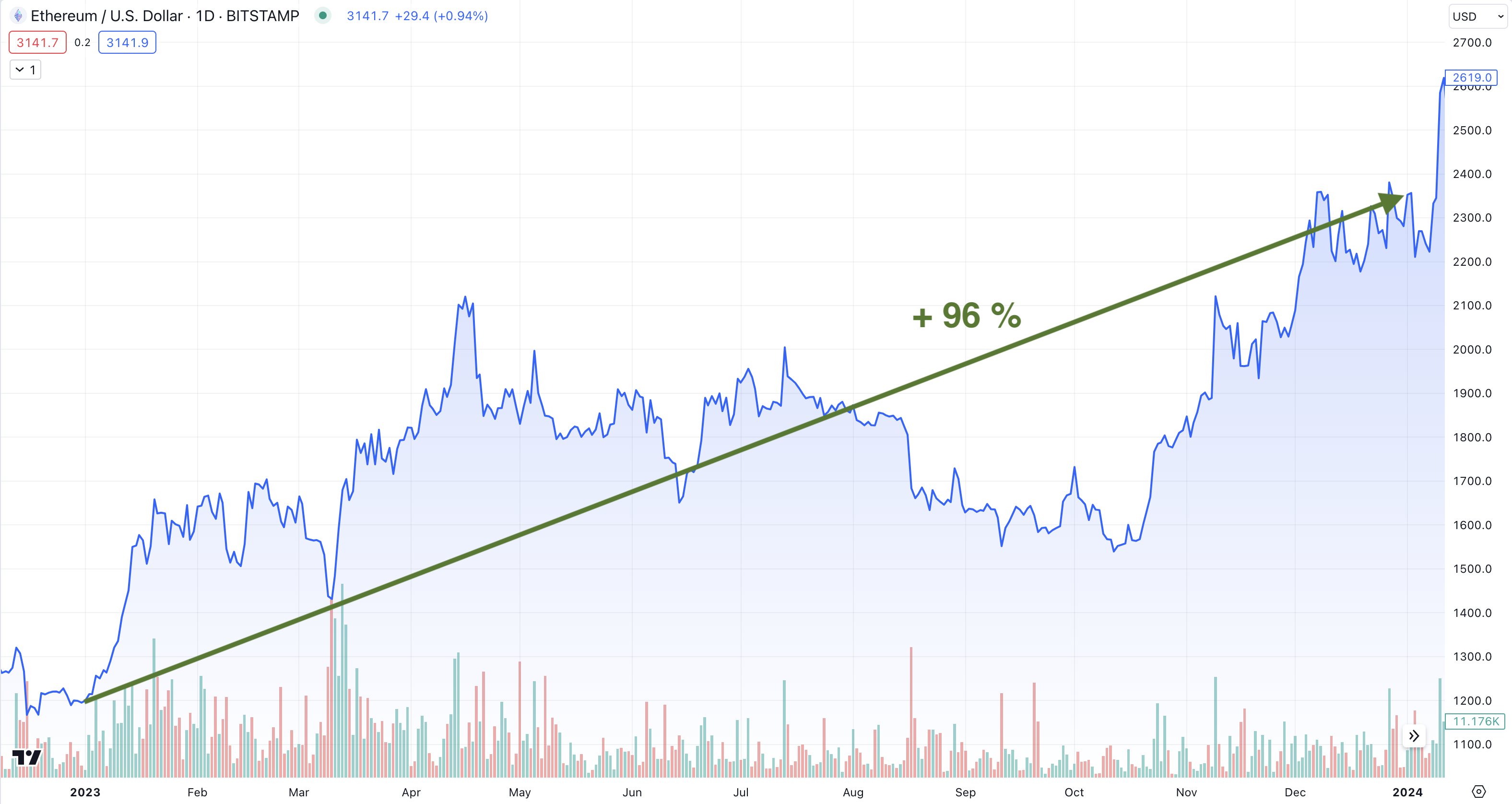 År 2023 steg etheremkursen med närmare 96 %. Från att ha varit värt 1 201 USD i början av året, till att vara värt 2 357 USD i slutet av året.