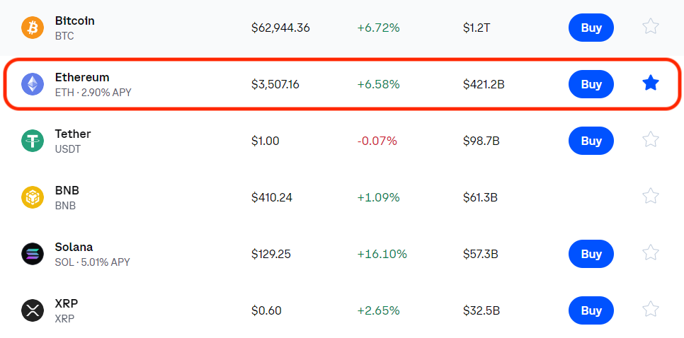 Exempel: Nedan visas en skärmdump från Coinbase. Alla kryptovalutor visas i amerikanska dollar (USD). På bilden går det bland annat att se hur ethereum under tillfället då skärmdumpen togs värderades till 3 507,16 USD per coin. Det går även att göra egna inställningar för att visa andra kurser, som exempelvis EUR eller SEK.