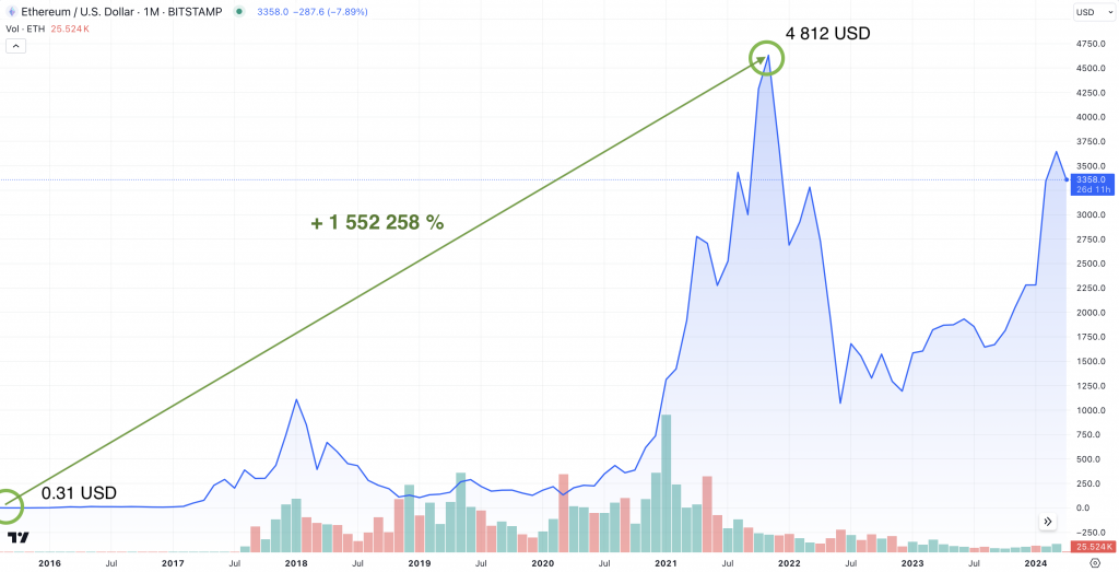 I början av år 2024 kostade ethereum 3 358 USD. Jämför man hur mycket ethereum kostade vid lansering i jämförelse mot priset i början av 2024, har ethereum givit en totalavkastning på 1 083 226 %. Det är lika med en ackumulerad avkastning på ca 181 % per år.