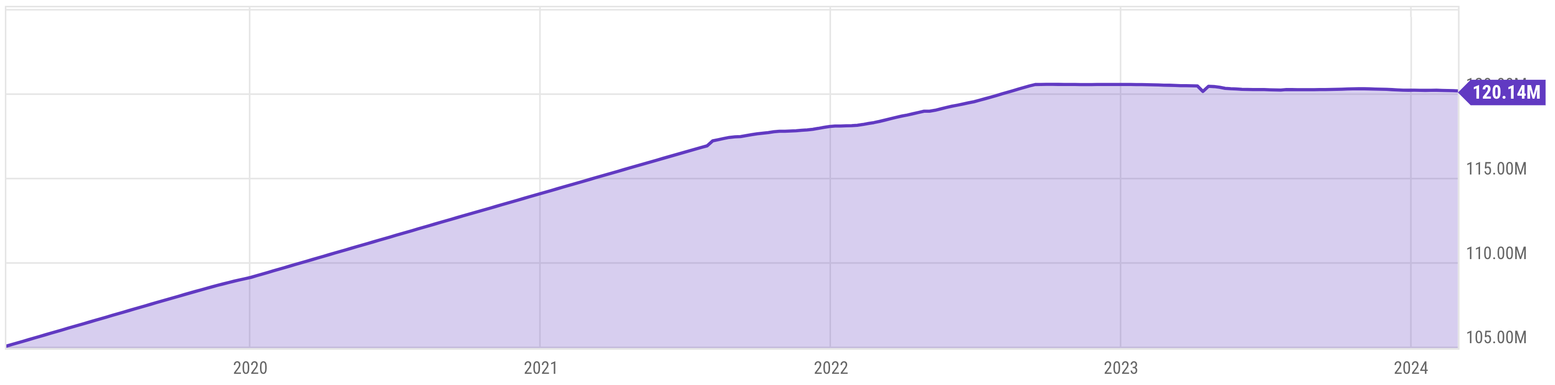 Grafen ovan visar hur ethereum visat på deflation sedan slutet av år 2022. Då fanns det totalt 120,53 miljoner ETH i omlopp. I början av 2024 fanns det istället 120,14 miljoner ETH i omlopp. Det ger en deflationseffekt på ungefär 0.32 % (eller inflation på – 0.32 %) under en period på ett och ett halvt år.