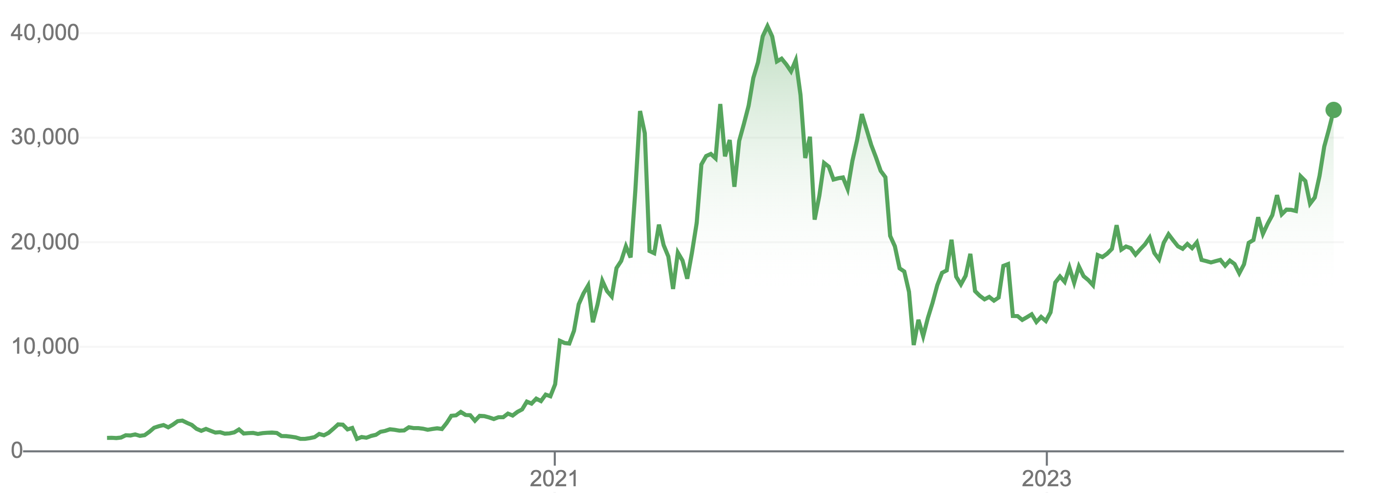 Man ansåg att detta kunde komma att ingjuta förtroende för kryptomarknaden. Samtidigt skulle ett godkännande av en Bitcoin ETF kunna skapa stora kapitalflöden till bitcoin och övriga kryptovalutor. Nedan visas utvecklingen för ethereumkursen år 2023.