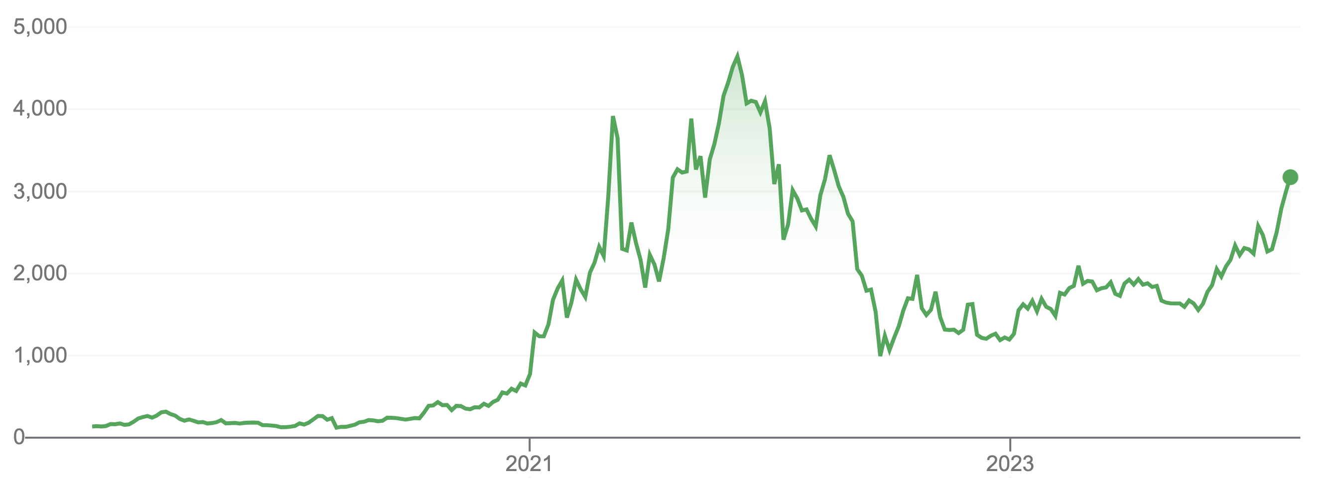 Nedan visas en graf över ethereumkursen i amerikanska dollar (USD). Tidsperioden sträcker sig från mitten av 2015 fram till början av 2024.