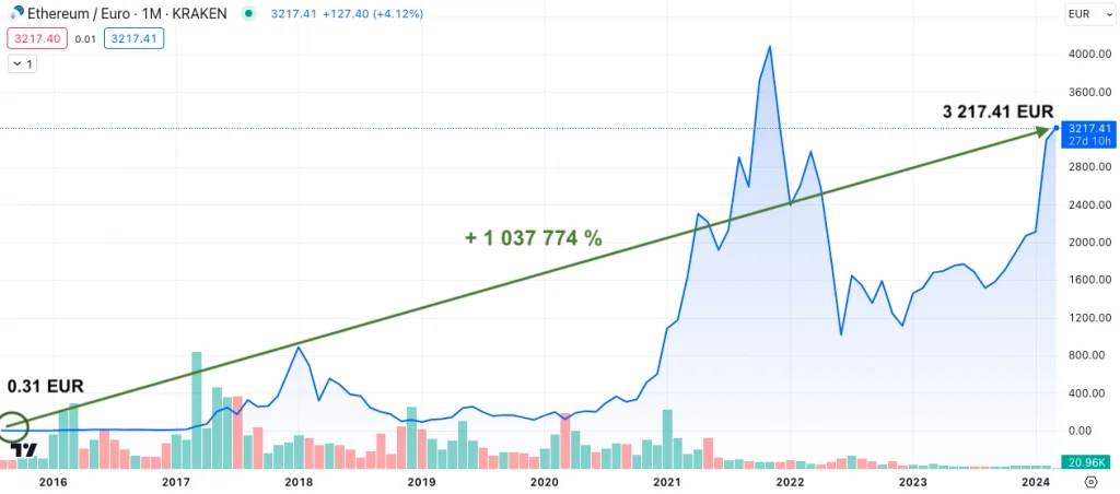 Mellan 2019 och 2024 har ethereums värde ökat med 2 442 % mot euron. Det går också att uttrycka det som att ETH visat en ackumulerad värdeökning 89 % per år gentemot EUR.