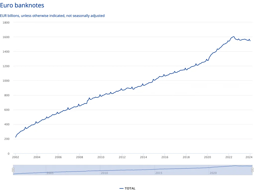 Värdet av alla eurosedlar mellan 2002 och 2024:
