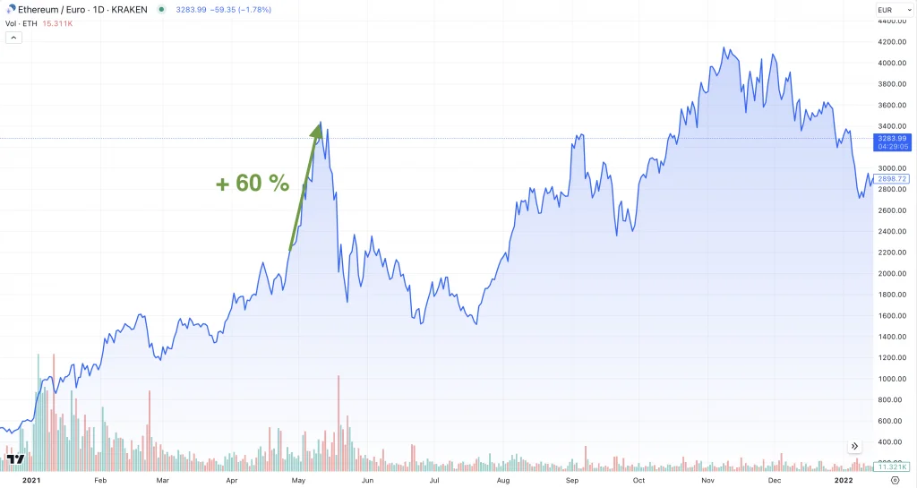 I grafen ovan visas kursutvecklingen för ethereum i euro år 2021. Enligt Reuters ökade etheremkursen med 5 % dagens efter att EIB släppt nyheten. Inom loppet av en månad ökade ethereumkuren från 2 157 EUR till 3 448 EUR. Det vill säga en ökning med nästan 60 %.