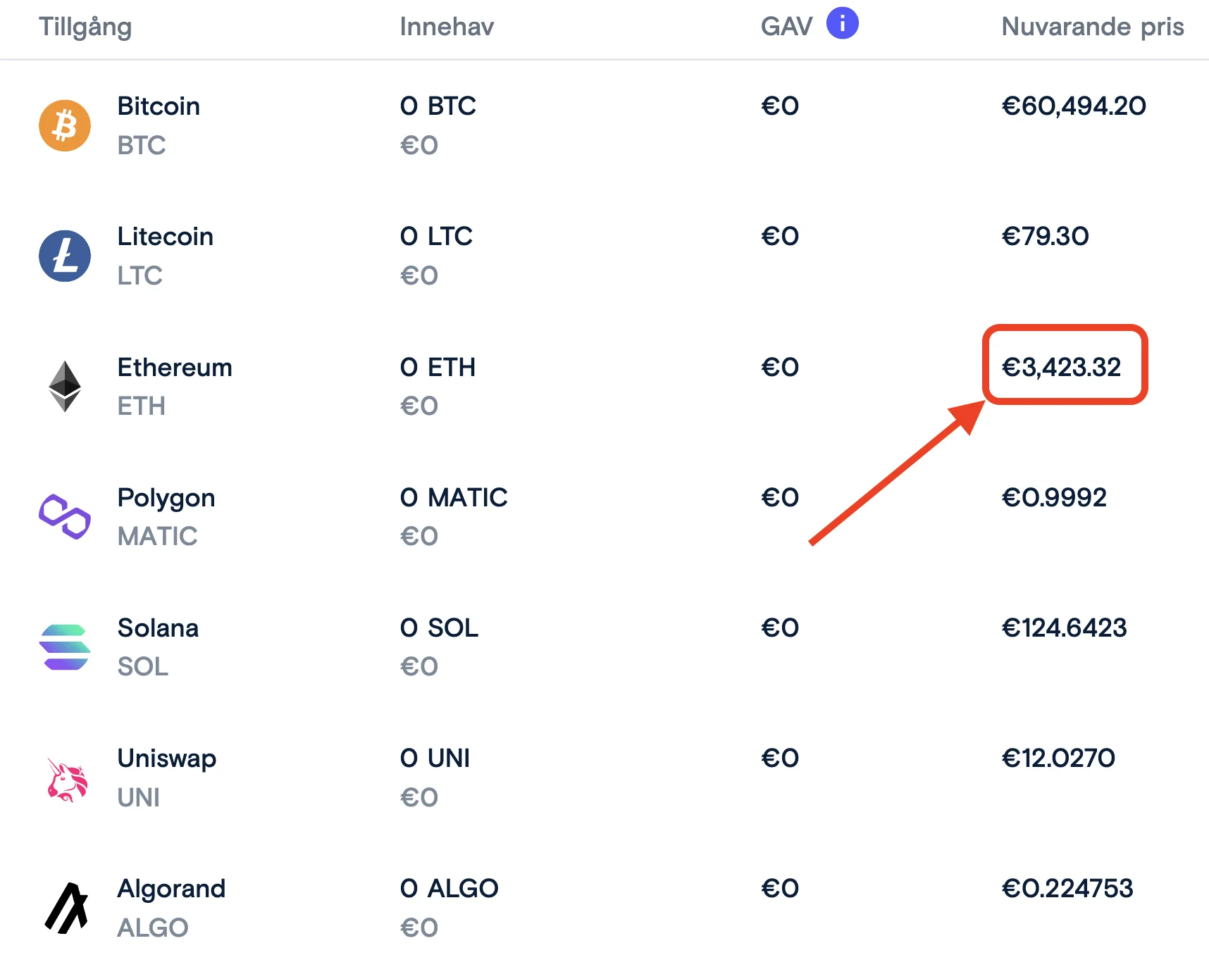 Exempel: Nedan ser du en skärmdump från deras handelsplats. Den visar hur ethereum och andra kryptovalutor prissätts i euro (EUR) respektive svenska kronor (SEK). Vid tillfället som skärmdumparna togs var en ETH prissatt till 3 423 EUR och 38 180 SEK.