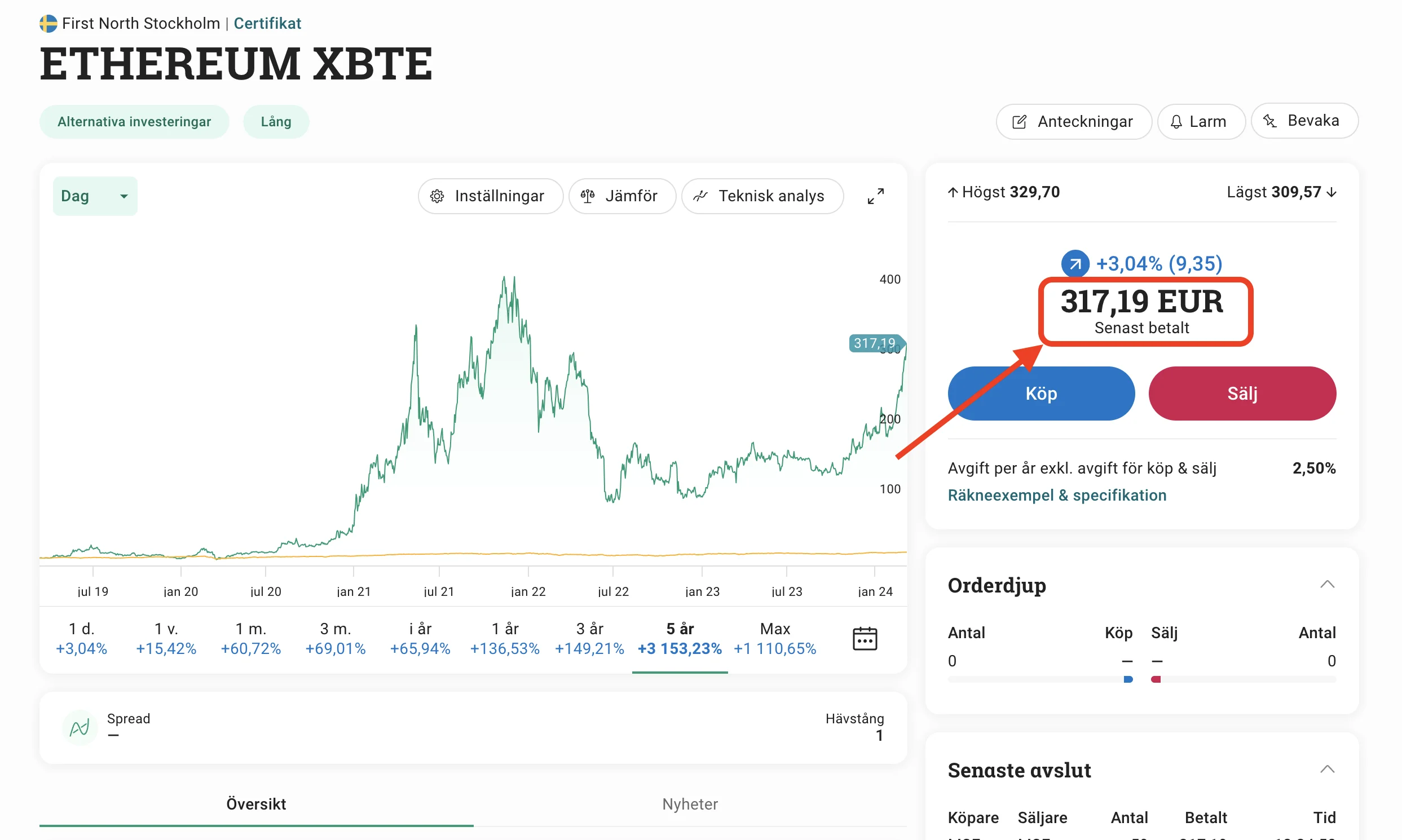 Exempel: Bilden nedan visar en skärmdump från Avanza på certifikatet “Ethereum XBTE”. Det är ett trackercertifikat som prissätts i euro och som kostar cirka 2.50 % i förvaltningsavgift per år. Certifikatet följer prisutvecklingen på ethereum från de 3 mest likvida digitala börserna. Det kostade 317.19 EUR då skärmdumpen togs.