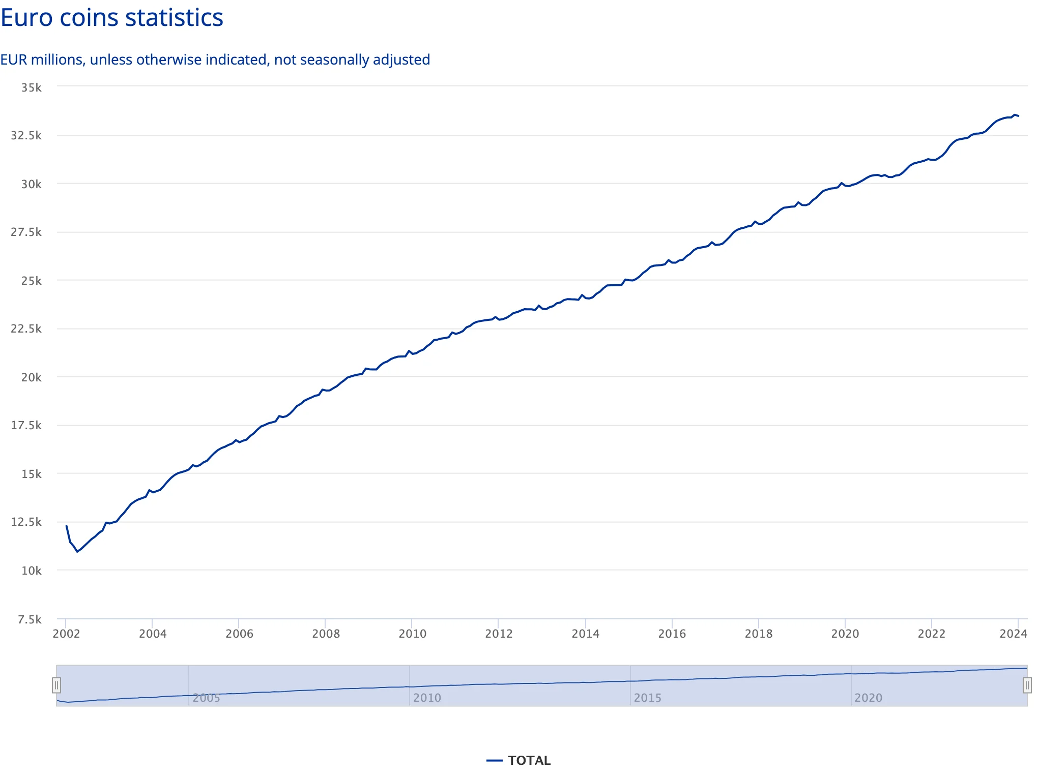 - År 2002 – År 2002 uppgick det totala värdet av all euro till 234 miljarder EUR (sedlar = 221 miljarder EUR + mynt = 12 miljarder EUR).