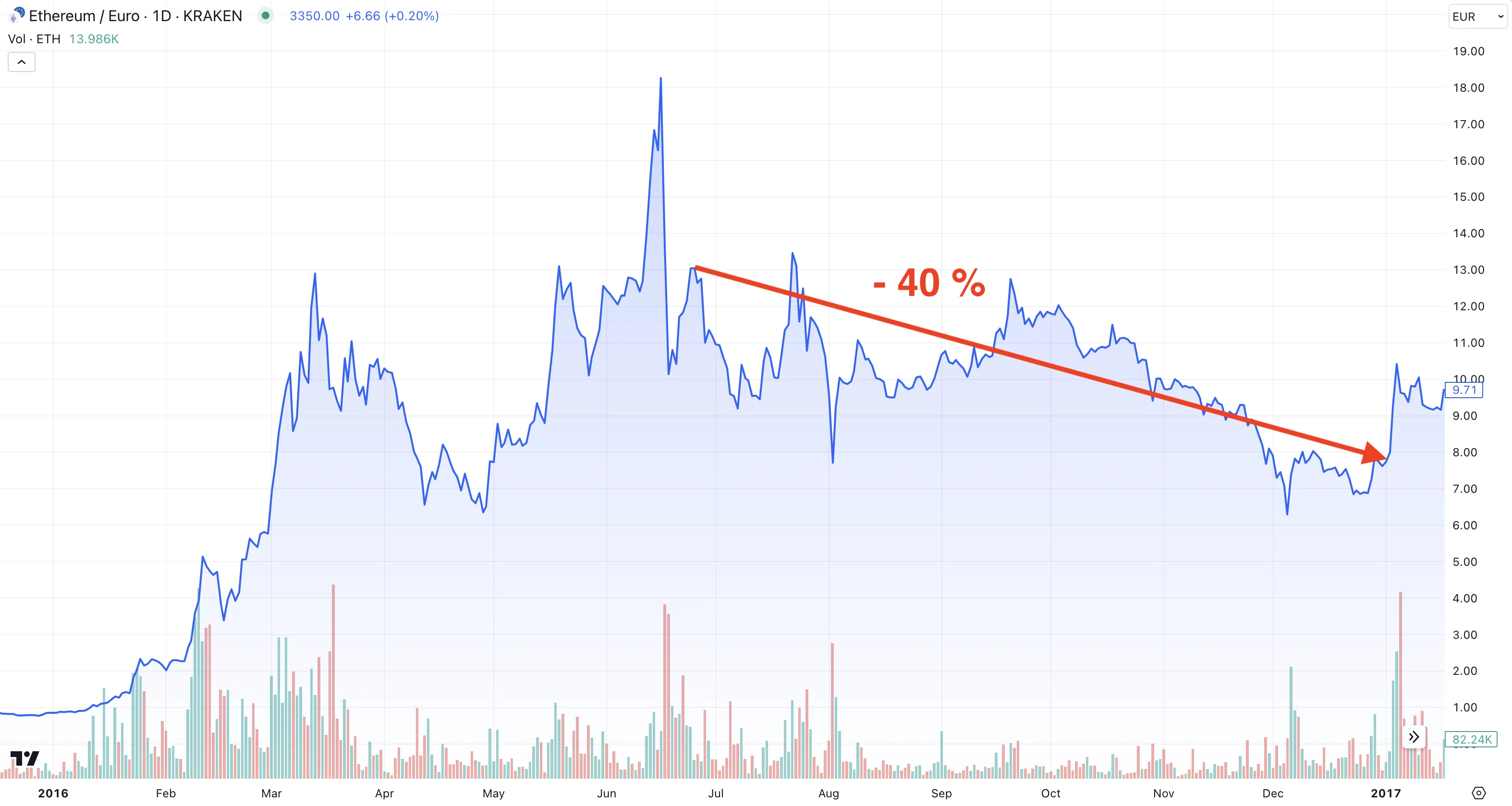 Detta skapade på kort sikt mycket osäkerhet varpå hela finansmarknaden gick ner och att man då lämnade risktillgångar som exempelvis ethereum. I grafen nedan visas kursutveckling för ethereum år 2016.