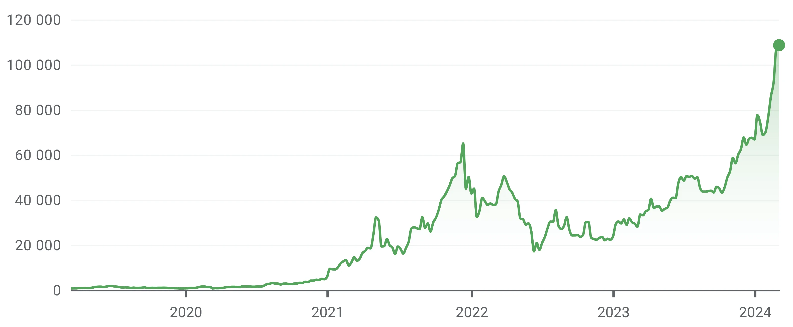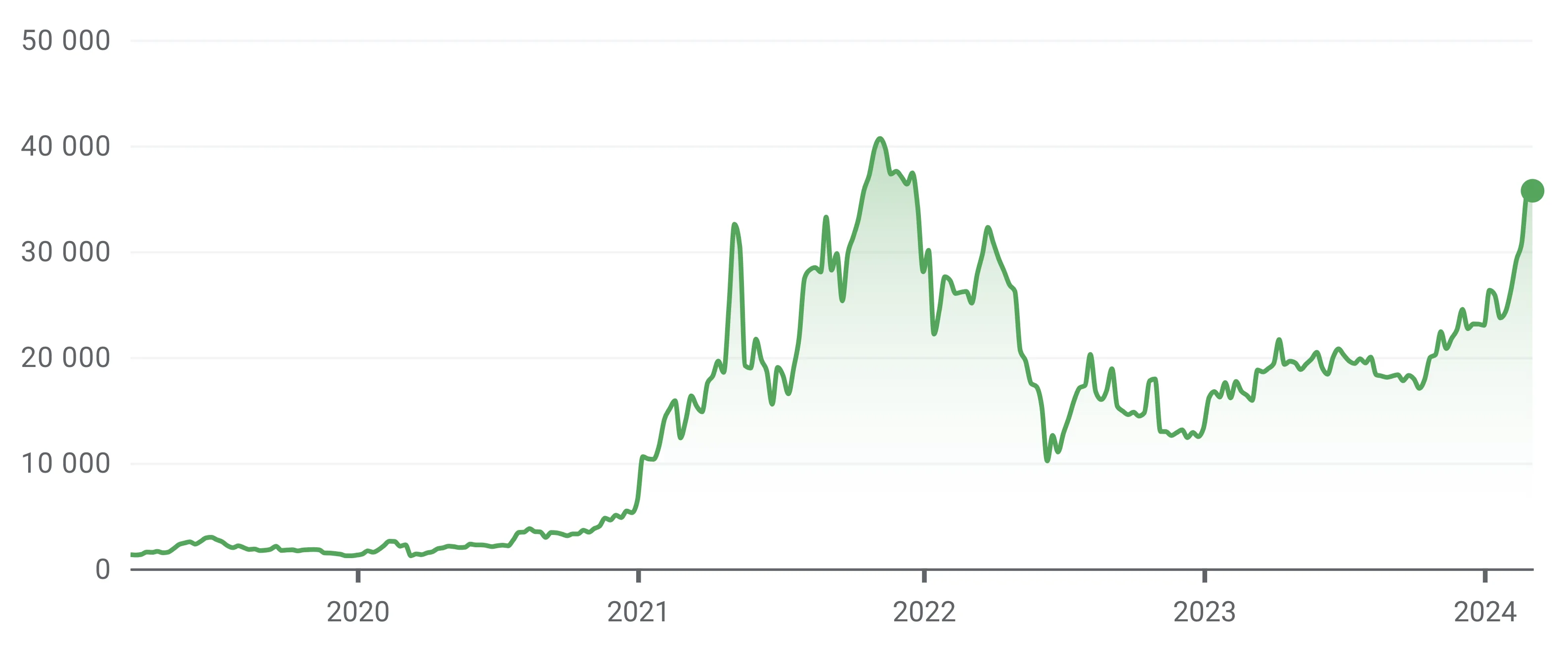 Utifrån grafen ovan går det att se hur ethereum visat på en positiv trend på lång sikt. Även om det är en volatil tillgång så har intresset för ethereum, och kryptovalutor i överlag, stigit i takt med att de blivit allt mer inkluderade i vårt samhälle.
