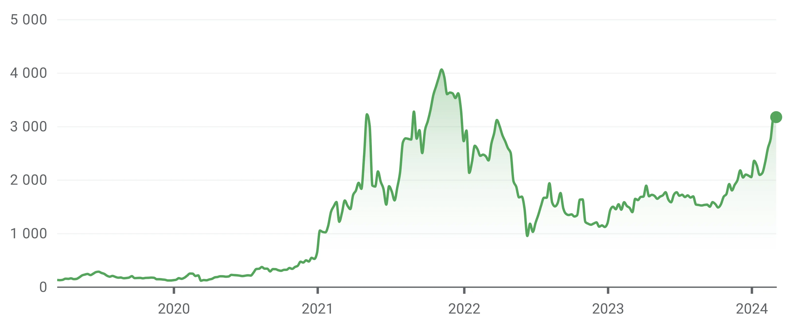 Förkortningen “EUR” står för euro, vilket är EU:s officiella valuta. Nedan visas ethereums kursutveckling i euro, under en 5-årsperiod, mellan 2019 och 2024.