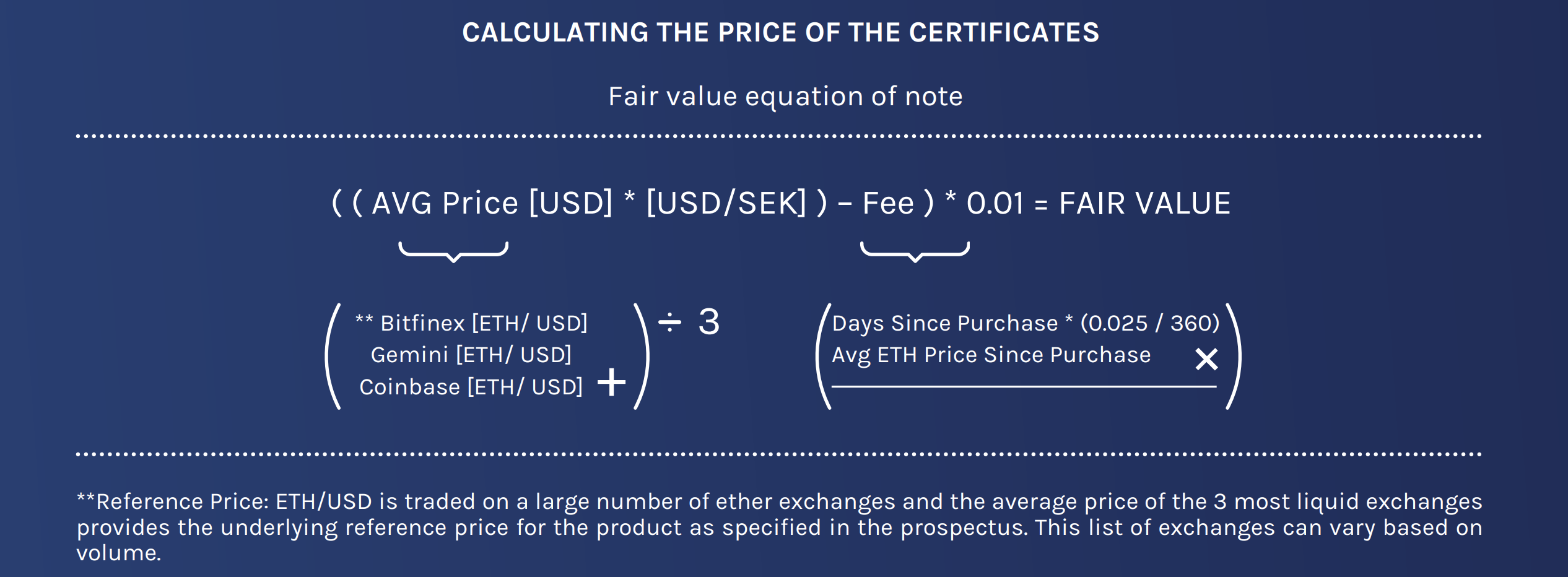 Certifikatet är både fysiskt uppbackat och syntetiskt uppbackat. Det betyder att en andel ethereum köps för att säkerställa att certifikatets prisutveckling sker i likhet med ethereumkursen. Den andra andelen sker med hjälp av derivatakontrakt.