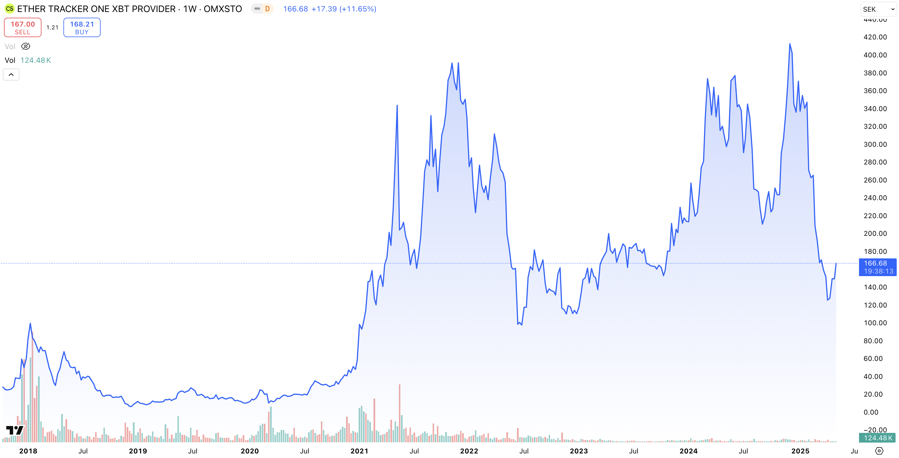 - Måste betala en årsavgift – För Ethereum XBT tillkommer en årsavgift på 2.50 %. Det bidrar till att avkastningen med tiden kommer att bli lägre än att direkt investera i den underliggande tillgången.
