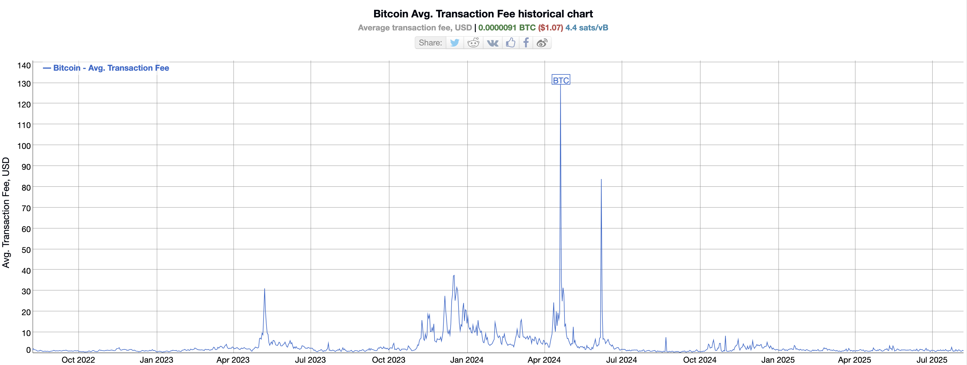 Grafen ovan visar historik över den genomsnittliga nätverksavgiften mellan augusti 2022 och augusti 2025. Snittavgiften under denna period uppgick till 0.0000091 BTC per transaktion. Det motsvarade då cirka 1.07 USD (ungefär 10 SEK).