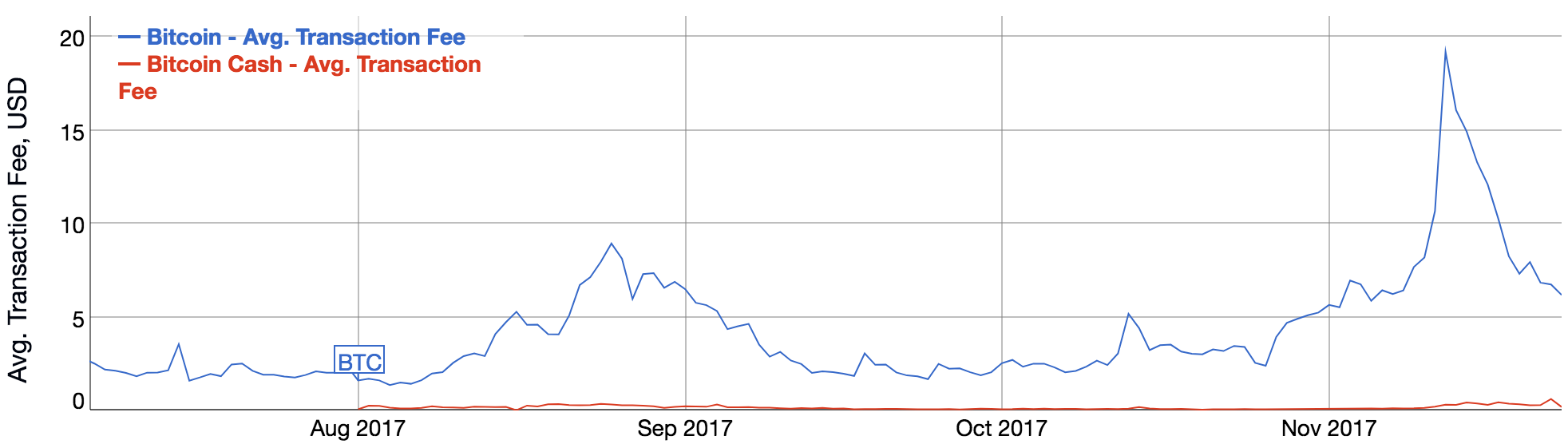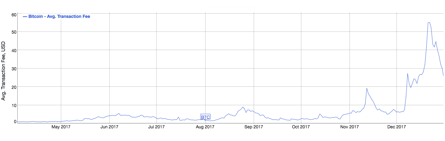 År 2017 ökade intresset för bitcoin kraftigt. Det ledde till att dess nätverk blev överbelastat. Som en effekt av ett överbelastat nätverk tog transaktioner längre tid att genomföra, samtidigt som transaktionskostnaderna ökade. Bilden nedan visar hur genomsnittliga transaktionskostnaden ökade kraftigt.