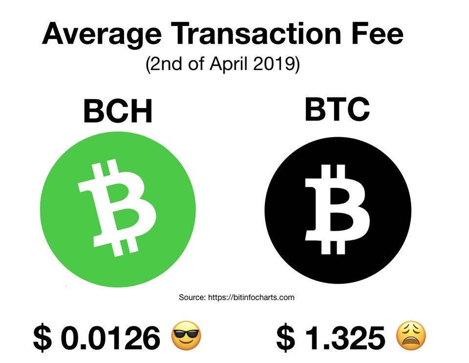 - Lägre transaktionsavgifter – De större blocken och den ökade kapaciteten har lett till att transaktionsavgifterna, för att skicka Bitcoin Cash mellan plånboksadresser, är betydligt lägre än för bitcoin. Bilden nedan visar skillnaden i genomsnittlig transaktionsavgift mellan Bitcoin cash och Bitcoin den 2:a april 2019.