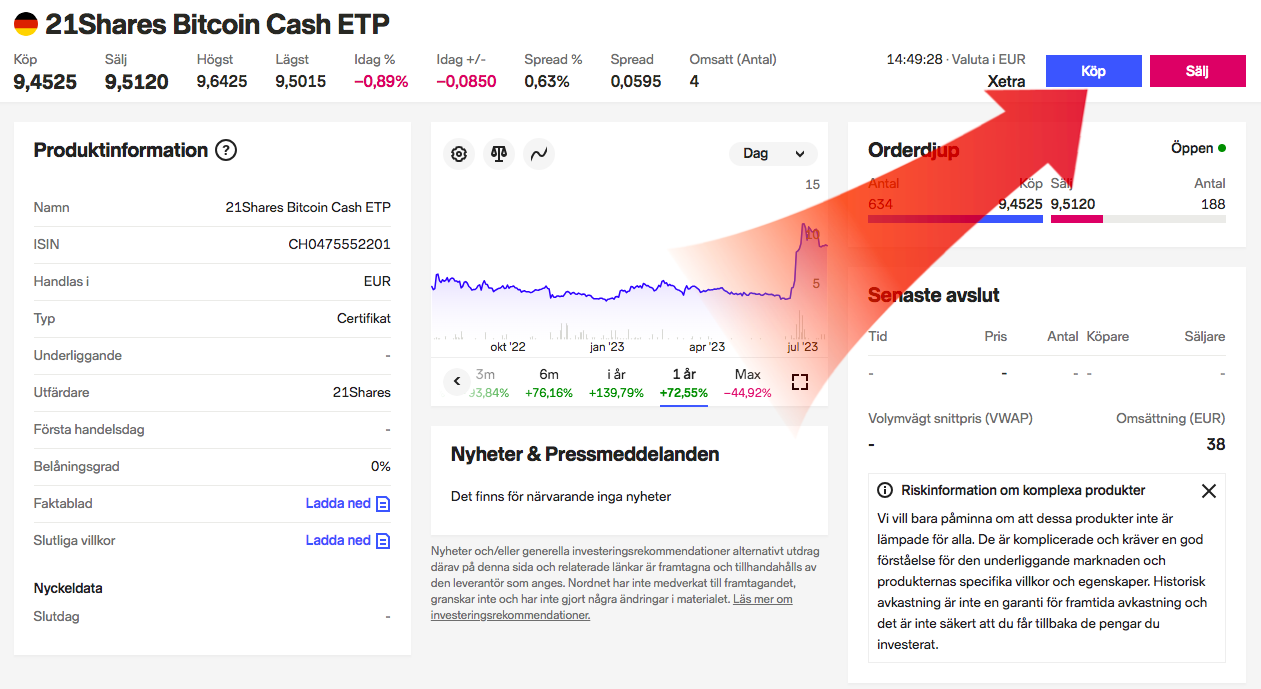 Nordnet är också en mycket populär mäklare i Sverige för handel med aktier och fonder. Nordnet erbjuder vanligtvis fler certifikat än Avanza. Men vad gäller Bitcoin Cash så erbjuder de exakt samma certifikat, ”21Shares Bitcoin Cash ETP”. Kostnaden över tid är densamma på 2.77 % per år.