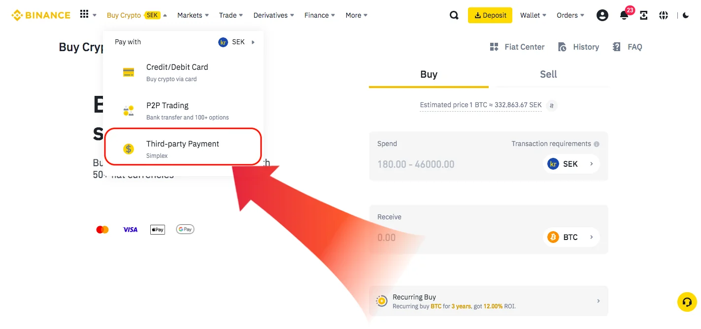 För att köpa Bitcoin Cash snabbt och enkelt kan du dra musen över “Buy Crypto” uppe till vänster i menyn. Välj sedan önskad betalmetod. Bitcoin Cash kan endast handlas på Binance via tredjepartsbetalning med Simplex. Klicka på ”Third-party Payment” →