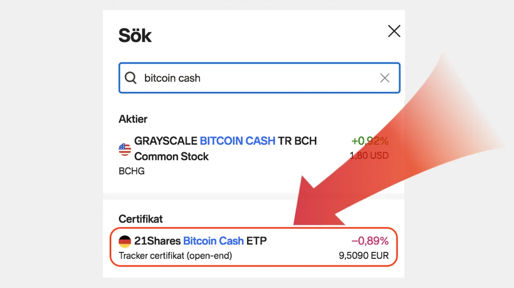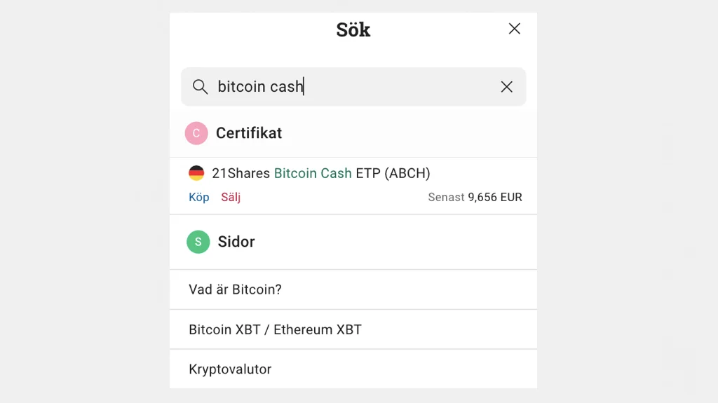 Har du pengar på ditt konto? Då klickar du på sökknappen och söker efter “Bitcoin Cash”. Alternativet som dyker upp är “21 Shares Bitcoin Cash ETP”. Klicka på den för att komma till köpsidan →