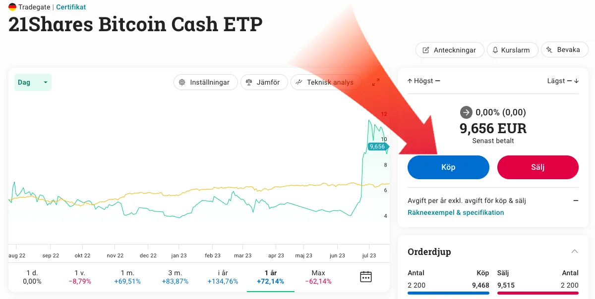 Du köper “21 Shares Bitcoin Cash ETP” genom att klicka på den blåmarkerade knappen “Köp” →