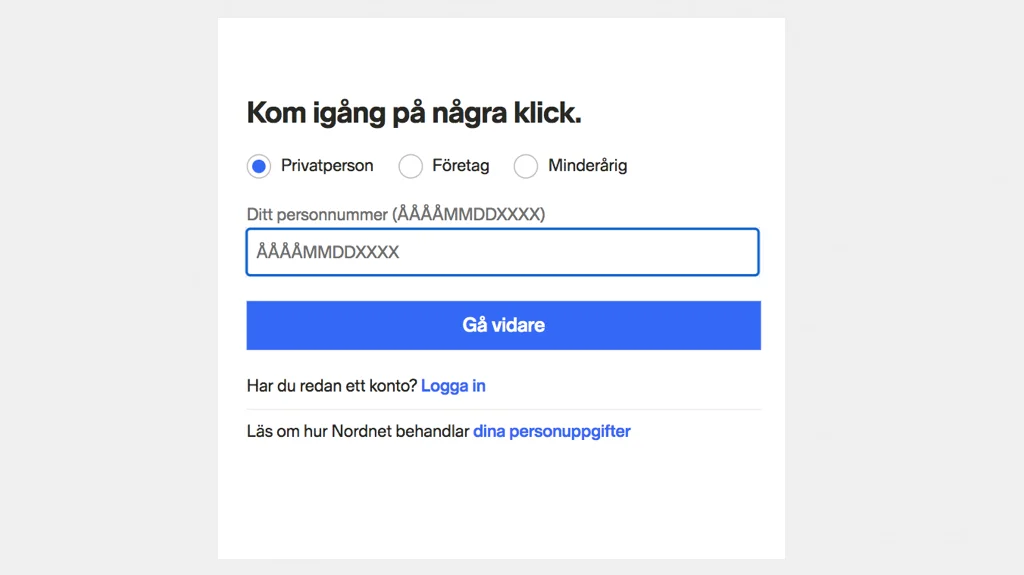 Första steget är att besöka Nordnets hemsida och registrera dig. Det tar endast 3 minuter med BankID. Gå till deras webbplats eller följ den här länken och klicka på “Bli Kund” →