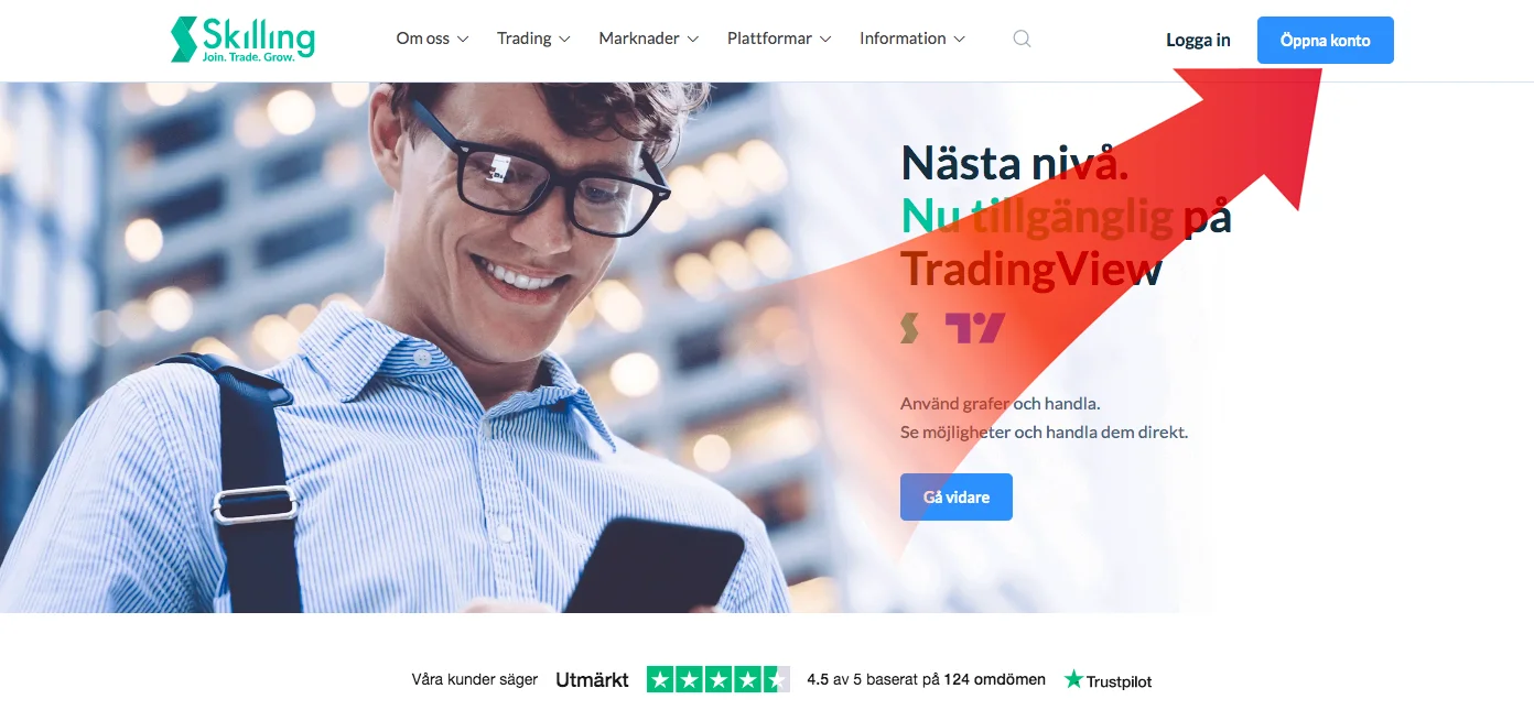 Det första steget är att skapa ett Skilling-konto. Gå till deras hemsida eller följ den här länken och klicka på ”Öppna konto” →