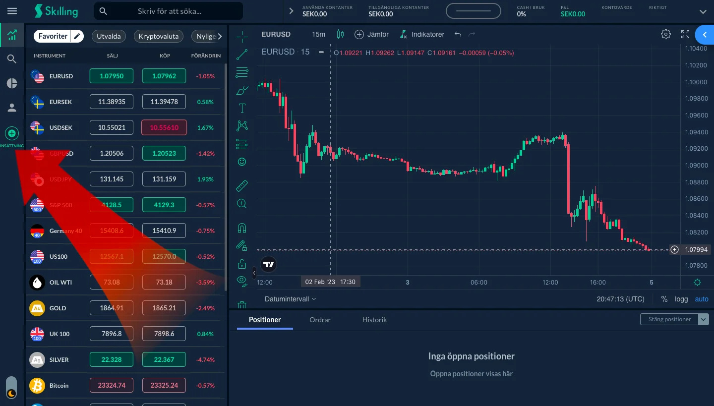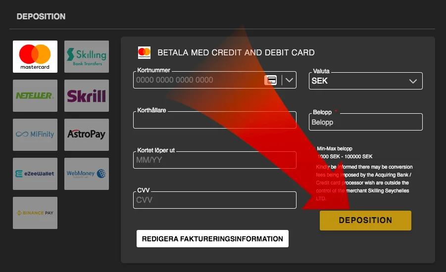 När din profil är klar är det dags att göra en insättning Detta gör du genom att klicka ”Insättning” till vänster i menyn →