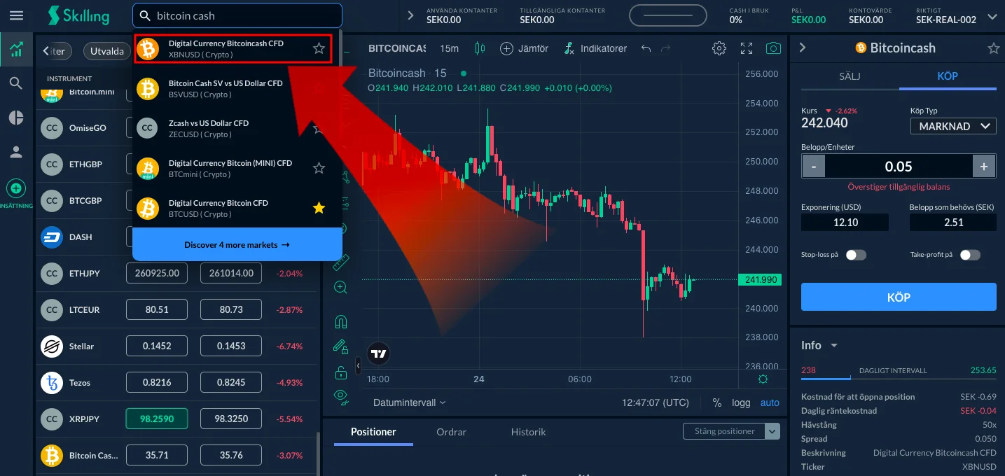 Skilling är en skandinavisk CFD-mäklare. På deras handelsplattform kan du investera i Bitcoin Cash genom att handla CFD-kontrakt. Som ägare av ett CFD-kontrakt har du rätt till eventuell kursförändring. Registrering och inloggning sker smidigt med hjälp av BankID.