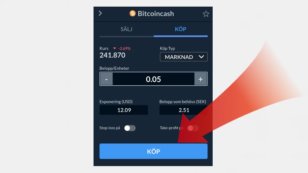 För att köpa Bitcoin Cash trycker du på “Trade” i navigeringsmenyn. Därefter kommer en detaljerad lista på tillgängliga kryptovalutor att visas med deras aktuella pris och kursförändring de senaste 24 timmarna. Välj Bitcoin Cash genom att klicka på “Buy”. Välj hur stor summa du vill köpa för →