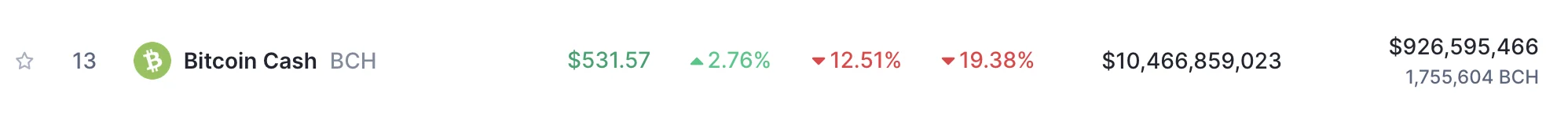 Den markerade rutan, åt vilken pilen är riktad, visar Bitcoin Cash totala marknadsvärde. Det går att jämför med bitcoin som täcker halva bilden.