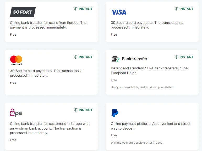 Utöver de klassiska som exempelvis banköverföring och kortinsättning kan insättning även ske med de digitala plånböckerna Skrill, Neteller och PayPal.