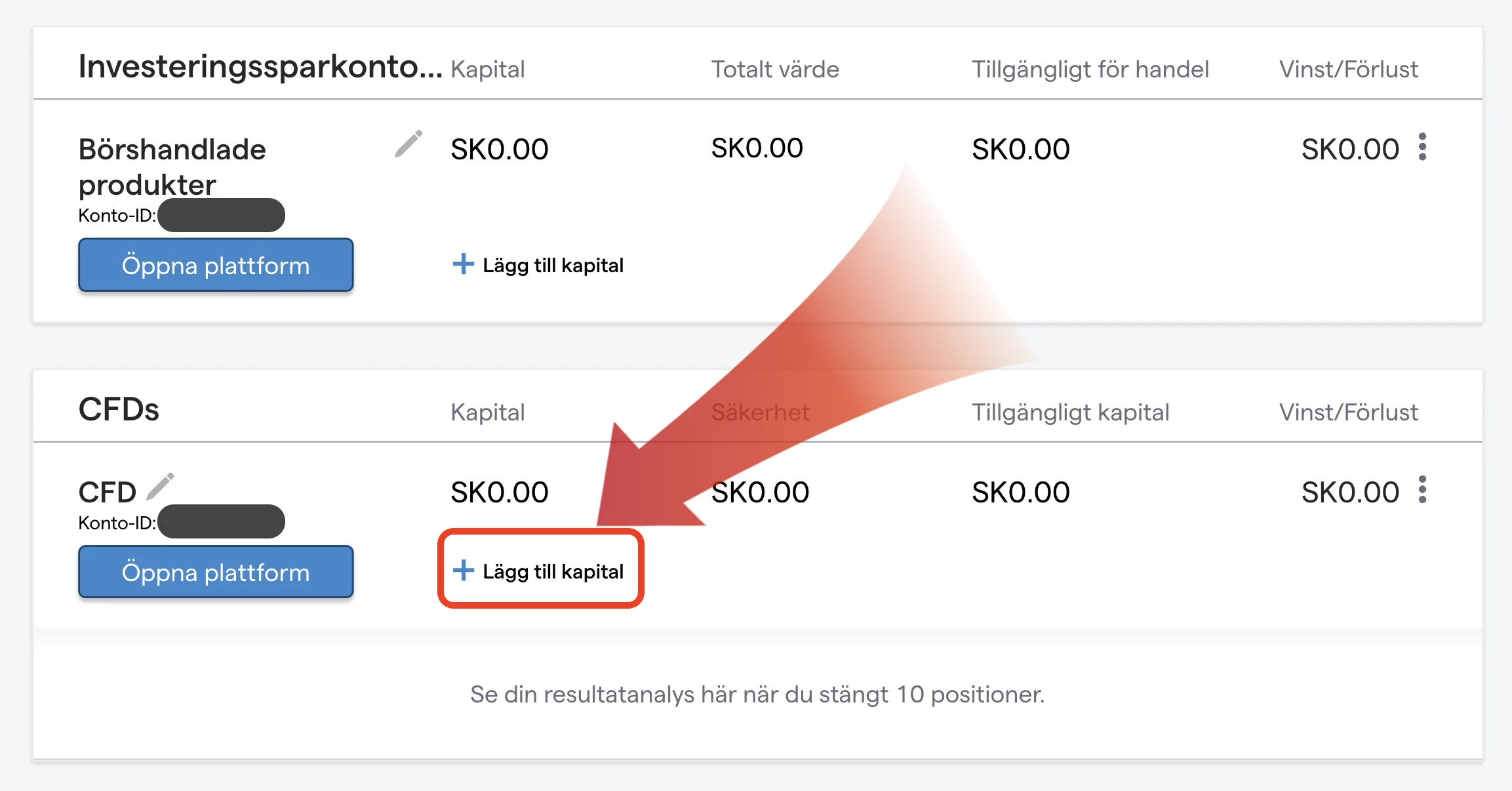 Logga in på IG och klicka på ”Dashboard” högst upp till vänster. Du ser nu aktiva konton hos mäklaren. Eftersom investering i Bitcoin sker via CFD behöver du överföra pengar till ditt CFD-konto. Klicka på ”Lägg till kapital” under ditt aktuella saldo.