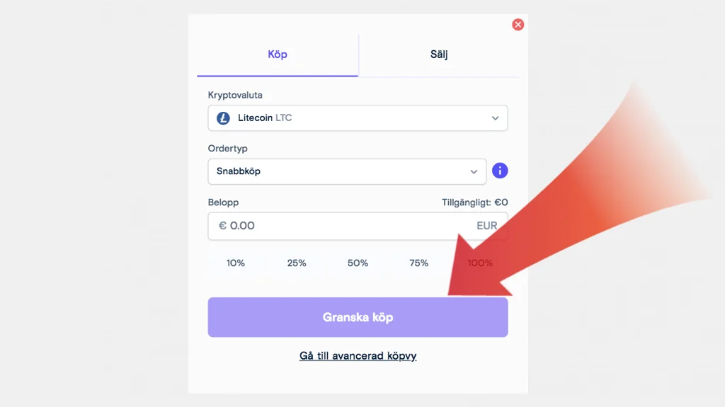 För att köpa Litecoin trycker du på “Trade” i navigeringsmenyn. Därefter kommer en detaljerad lista på tillgängliga kryptovalutor att visas med deras aktuella pris och kursförändring de senaste 24 timmarna. Välj Litecoin genom att klicka på “Buy”. Välj hur stor summa du vill köpa för →