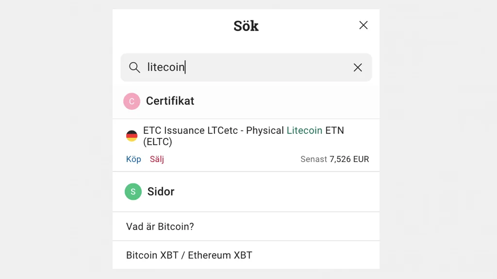 Har du pengar på ditt konto? Då klickar du på sökknappen och söker efter “Litecoin”. Ett alternativ som dyker upp är “CoinShares Physical Litecoin”. Klicka på den för att komma till köpsidan →