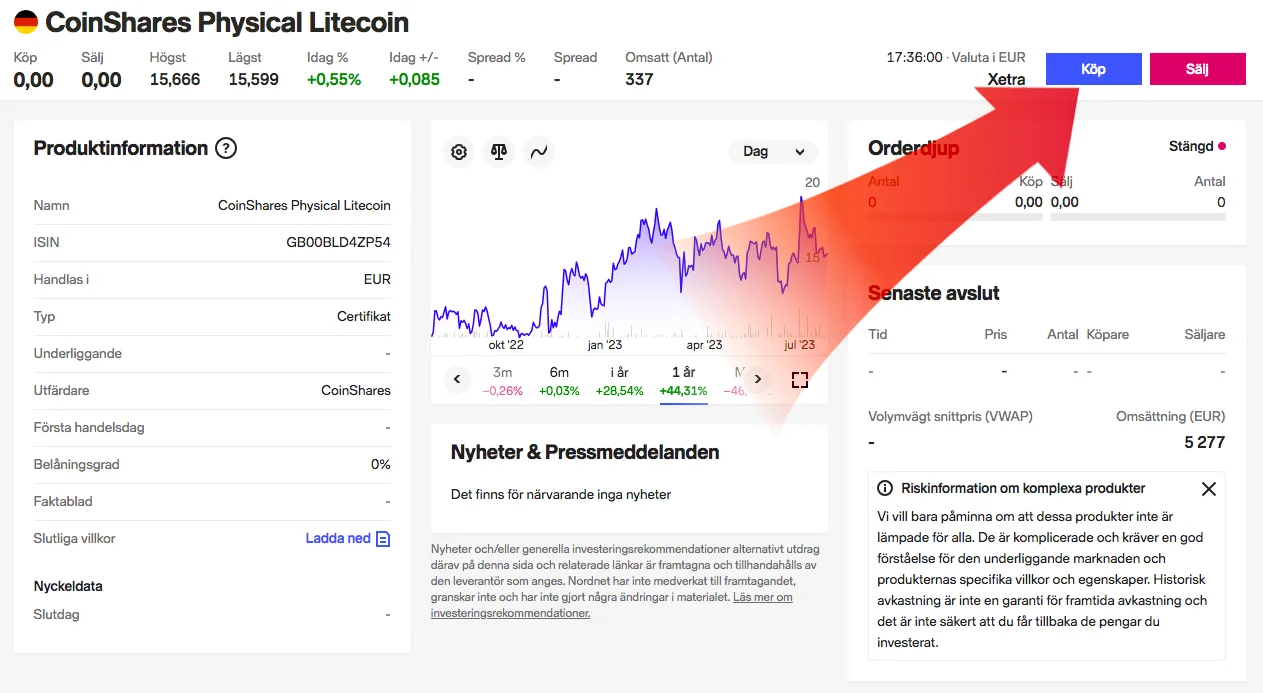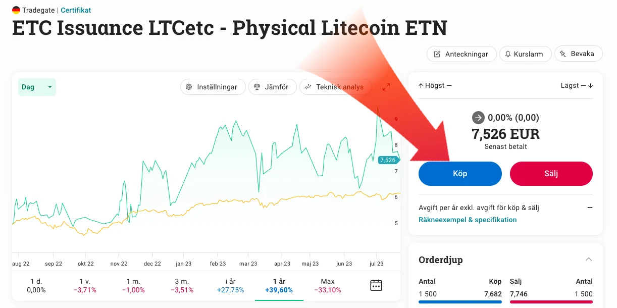 Du köper “ETC Issuance LTCetc – Physical Litecoin ETN” genom att klicka på den blåmarkerade knappen “Köp” →