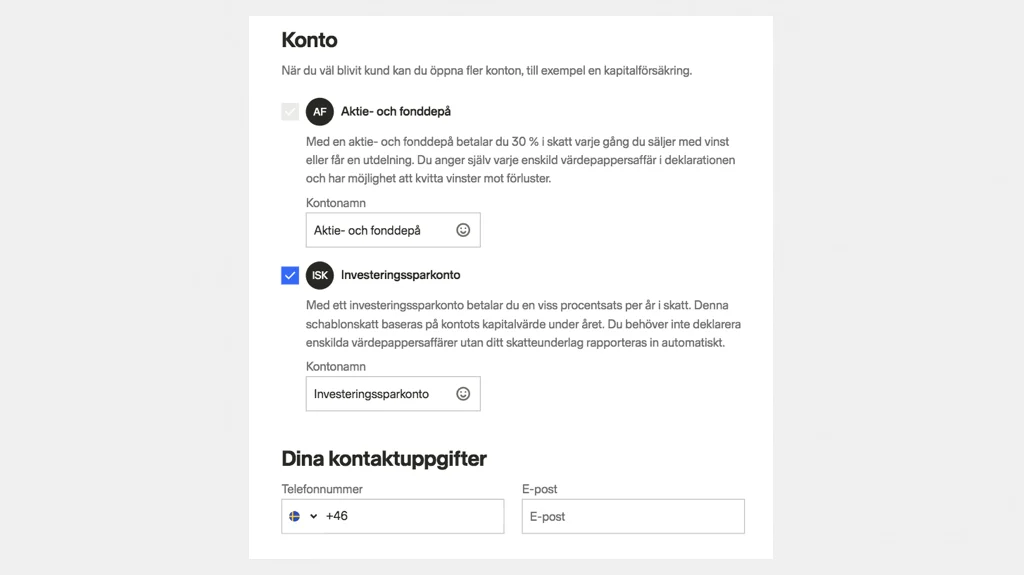 Nästa steg är att fylla i vilken typ av konto du vill öppna samt kontaktuppgifter och din erfarenhet av handel med värdepapper. I detta exempel väljer vi att öppna ett ISK-konto vilket rekommenderas. Fyll i uppgifterna och registrera dig med Mobilt BankID →