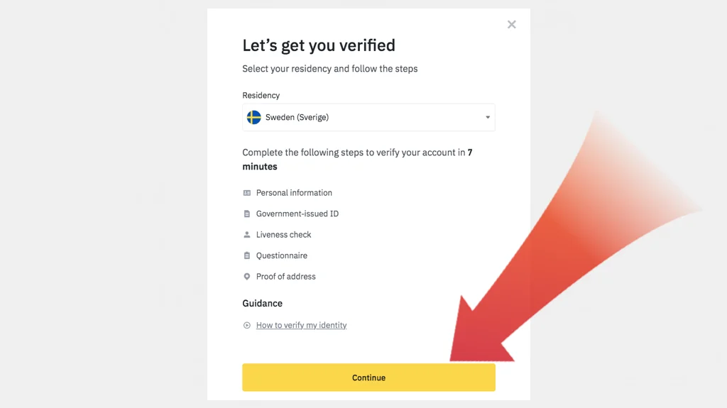 Innan du kan börja köpa Litecoin och andra kryptovalutor måste du verifiera din identitet. Detta gör du genom att ta ett foto på ditt pass, körkort eller annan ID-handling som bevisar din identitet. Klicka på “Continue” för att gå vidare →