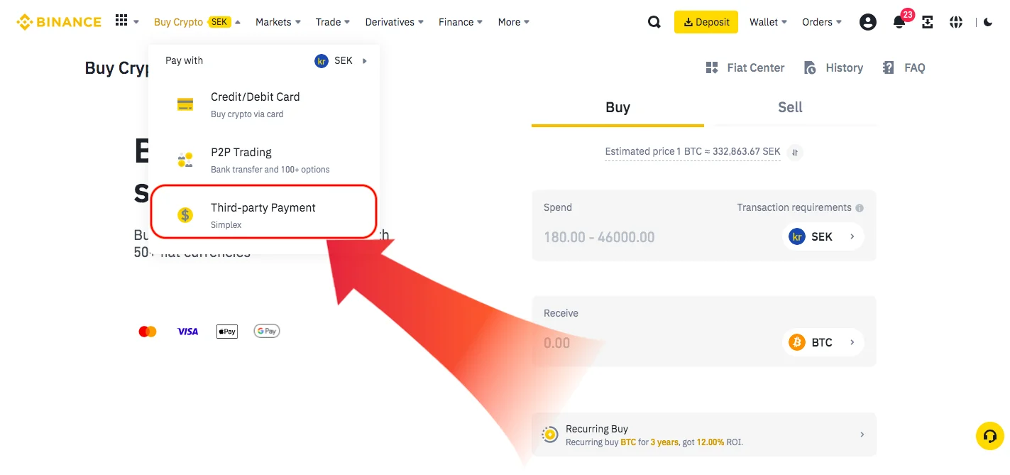 För att köpa Litecoin snabbt och enkelt kan du dra musen över “Buy Crypto” uppe till vänster i menyn. Välj sedan önskad betalmetod. Litecoin kan endast handlas på Binance via tredjepartsbetalning med Simplex. Klicka på ”Third-party Payment” →
