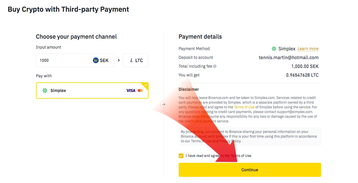 Välj hur stort belopp du vill köpa Litecoin för. Om det är första gången som du använder Simplex som betalningsmetod så tickar du även i att du accepterar deras villkor. Klicka sedan på “Continue”. Lägg till uppgifter för ditt debit- eller kreditkort och genomför ditt köp →