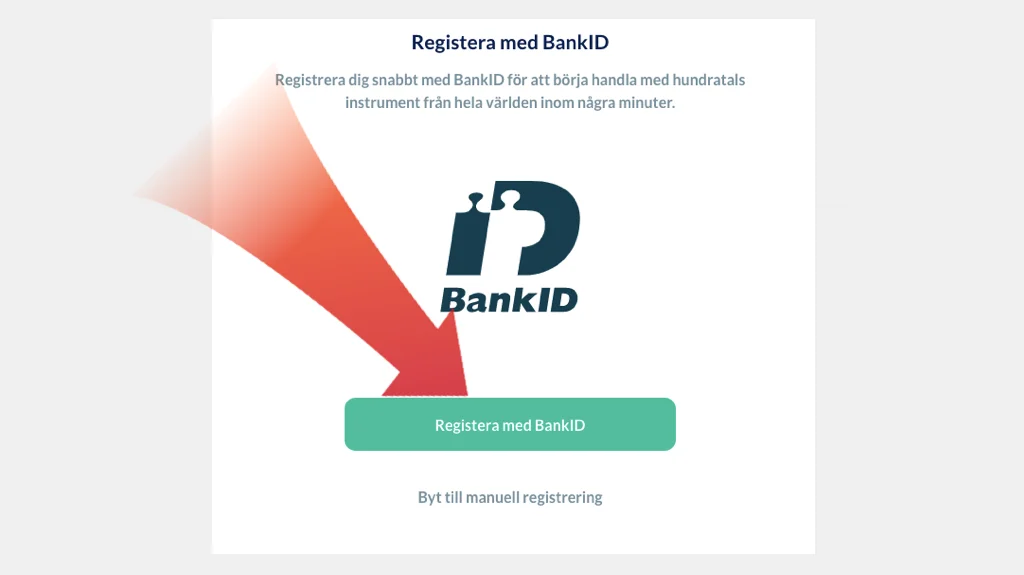 Nästa steg är att fylla i uppgifter för att registrera ett konto. Detta gör du enklast genom att registrera dig med Mobilt BankID. Följ därefter stegen och fyll i personuppgifterna. Detta tar endast några minuter →