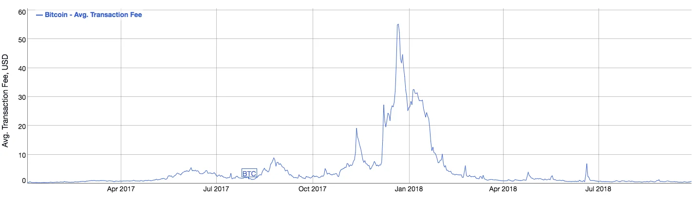 Bilden nedan visar hur nätverksavgiften varierar kraftig under olika tidsperioder. Det går exempelvis att se hur den stigit markant under tider då efterfrågan på kryptovalutor i allmänhet är hög. Som högst låg den på lite över 1.40 USD vid årsskiftet mellan 2017 och 2018.