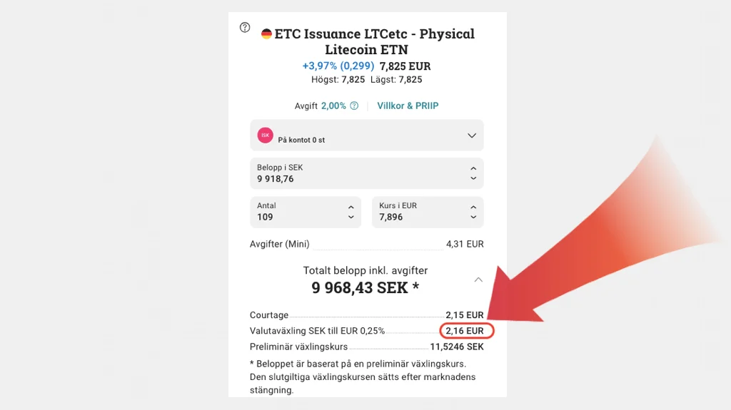 Exempel: Bilden nedan visar vilka avgifter som ingår vid köp av “ETC Issuance LTCetc – Physical Litecoin ETN” hos Avanza. Vid ett köp på 10 000 kr kommer växlingsavgiften att uppgå till 2.16 EUR. Det motsvarar cirka 21 kr år 2024.