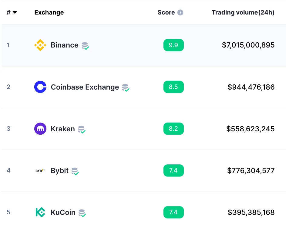 De kryptobörserna med störst handelsvolym är Binance och Coinbase. Tack vare deras stora handelsvolymer kan de erbjuda klart lägre spread än mindre mäklare, såsom Trijo. I början av 2024 låg Binance och Coinbase på position 1 och 2 vad gäller total handelsvolym under det senaste dygnet.