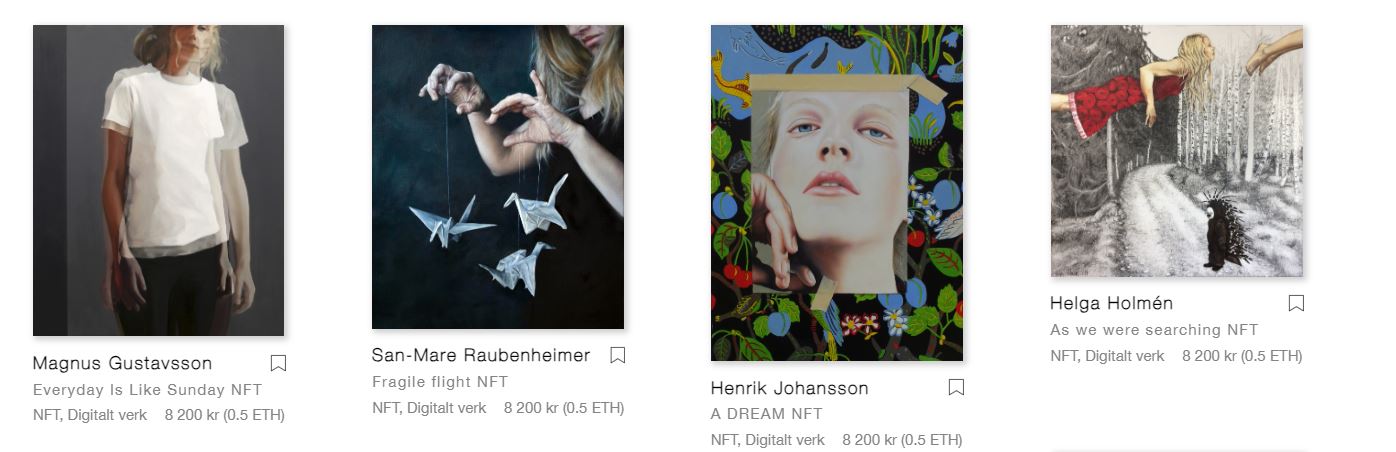 Det svenska galleriet Artely säljer både fysisk och digital konst. Försäljning av de digitala objekten (NFT konst) säljs via deras egen NFT-plattform. Anslut exempelvis MetaMask och betala med Ether. Det går därmed att köpa NFT konst från flera svenska konstnärer.